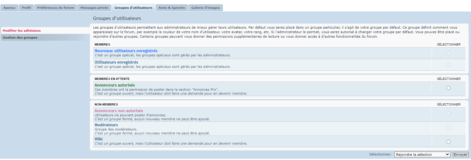 Je fais ma demande dans mon panneau de l’utilisateur onglet groupes d’utilisateurs puis j’ai sélectionné annonceurs autorisés et depuis ça mai membres en attente.
