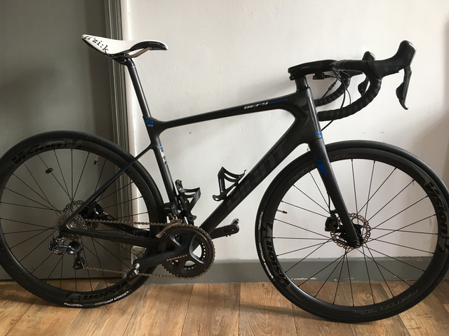 petite photo de mon giant Defy advanced pro 0 modèle 2015, monté avec une paire de metron 40 disc à pneus dont je suis ravi, en système d'axe traversant mais compatible cadre standard.