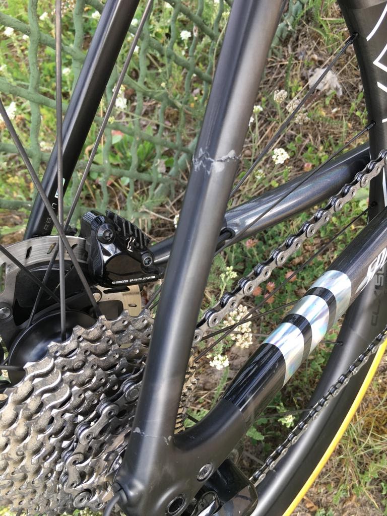 j'ai fait quelques dégâts lors d'une chute hier sur mon Tarmac SL6 (vieux de 2 mois seulement), voici quelques photos :